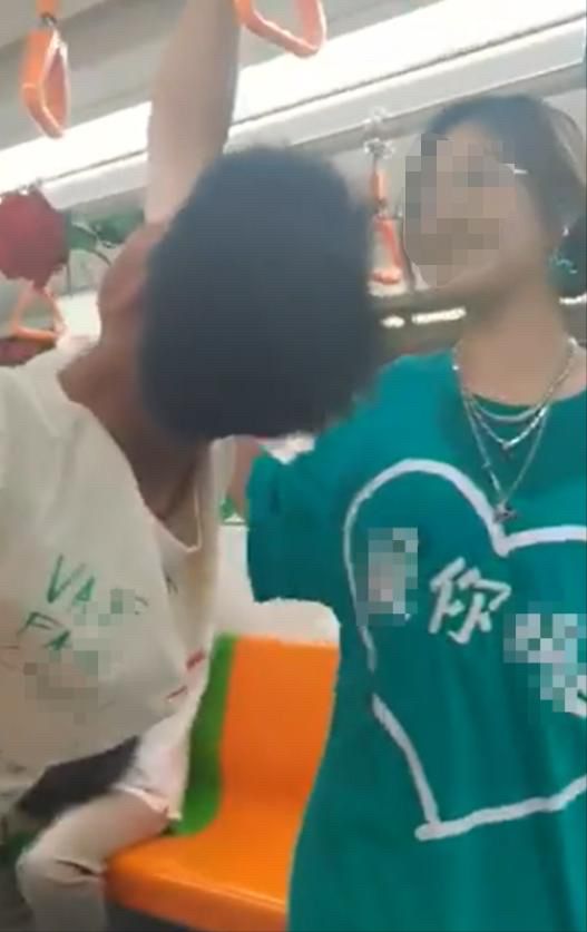 现场视频显示,在地铁车厢内,一名男子正悬挂在车厢顶部的扶杆上。男子身边还站着一名女子在放声唱歌,两人还不停嬉笑打闹,他们的T恤上都印有骂人的脏话。