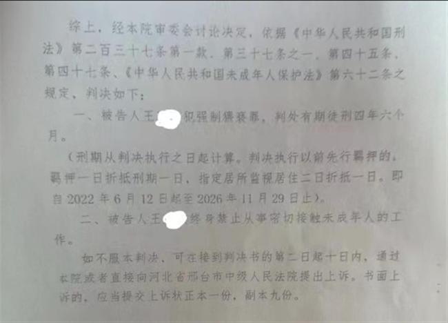 2023年3月,该案一审宣判,认定被告人王某某犯强制猥亵罪,判处有期徒刑四年六个月,并判令王某某终身禁止从事密切接触未成年人的工作。