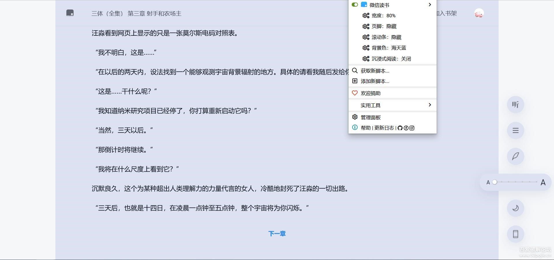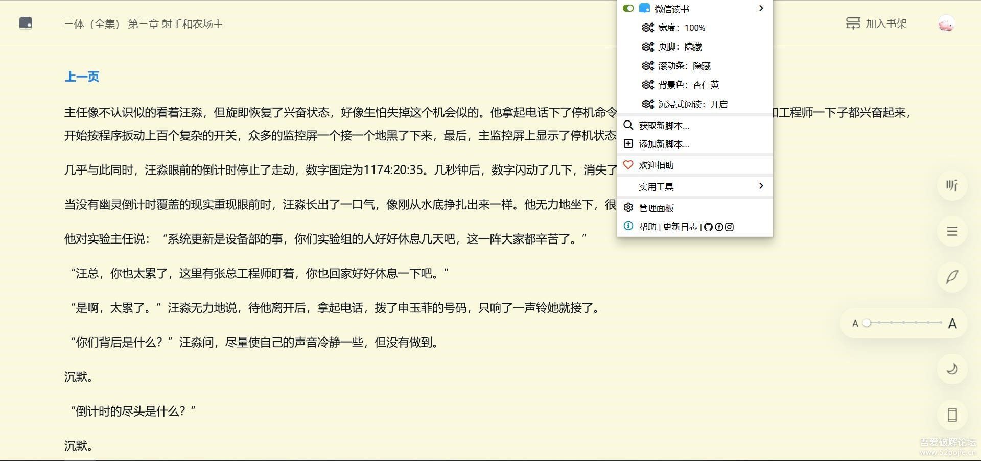 没有设置阅读界面按钮,而是通过油猴菜单,是为了更沉浸于阅读。