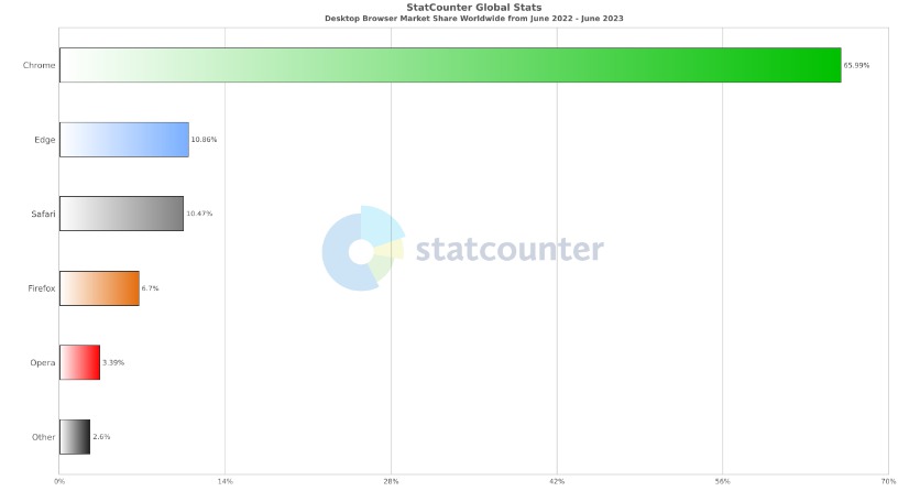 根据国际知名的统计网站statcounter提供的数据显示,截至今年6月,全球浏览器排名依次为Chrome、Edge、Safari、Firefox、Opera、Other。