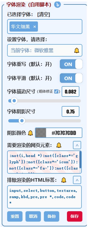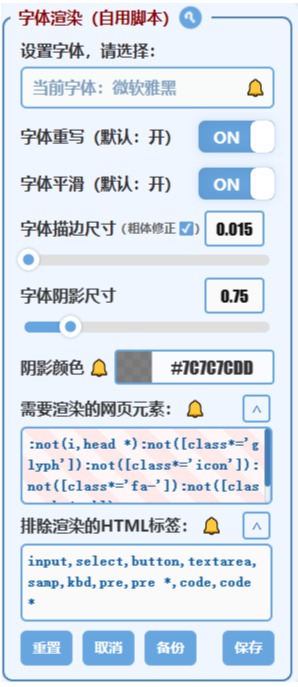 点击一下即可调出脚本管理面板,即可调出操作界面,支持字体更换、字体平滑度调节、字体阴影调剂等。