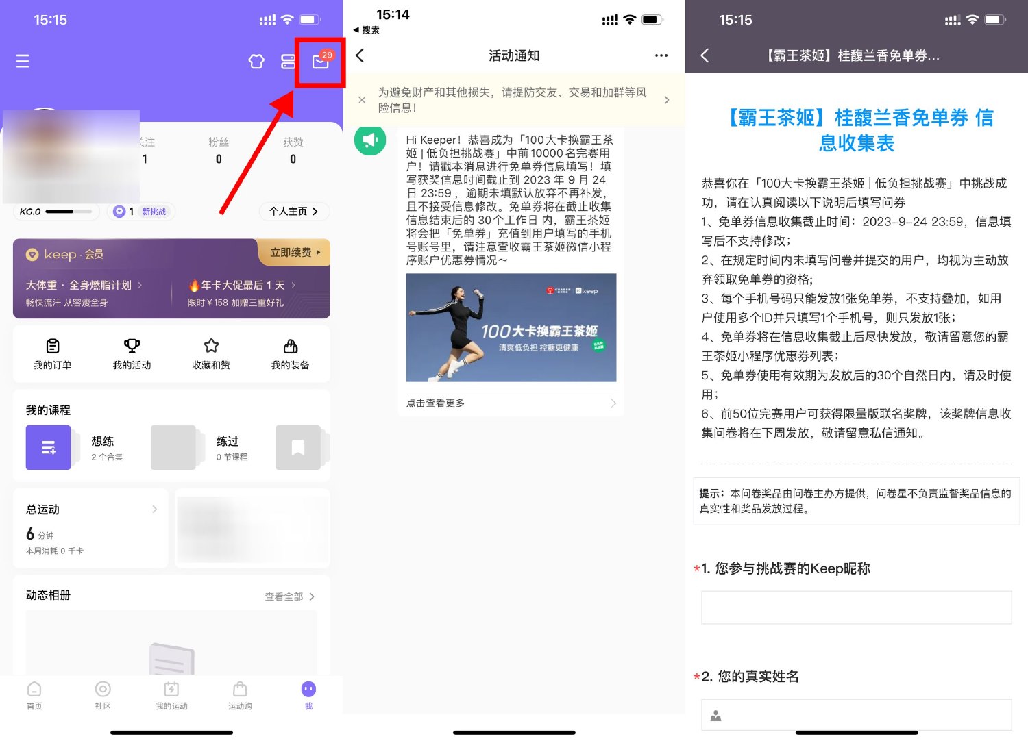 之前参与过keep霸王茶姬活动的,自己去Keep的APP查看消息填写领霸王茶姬免单券