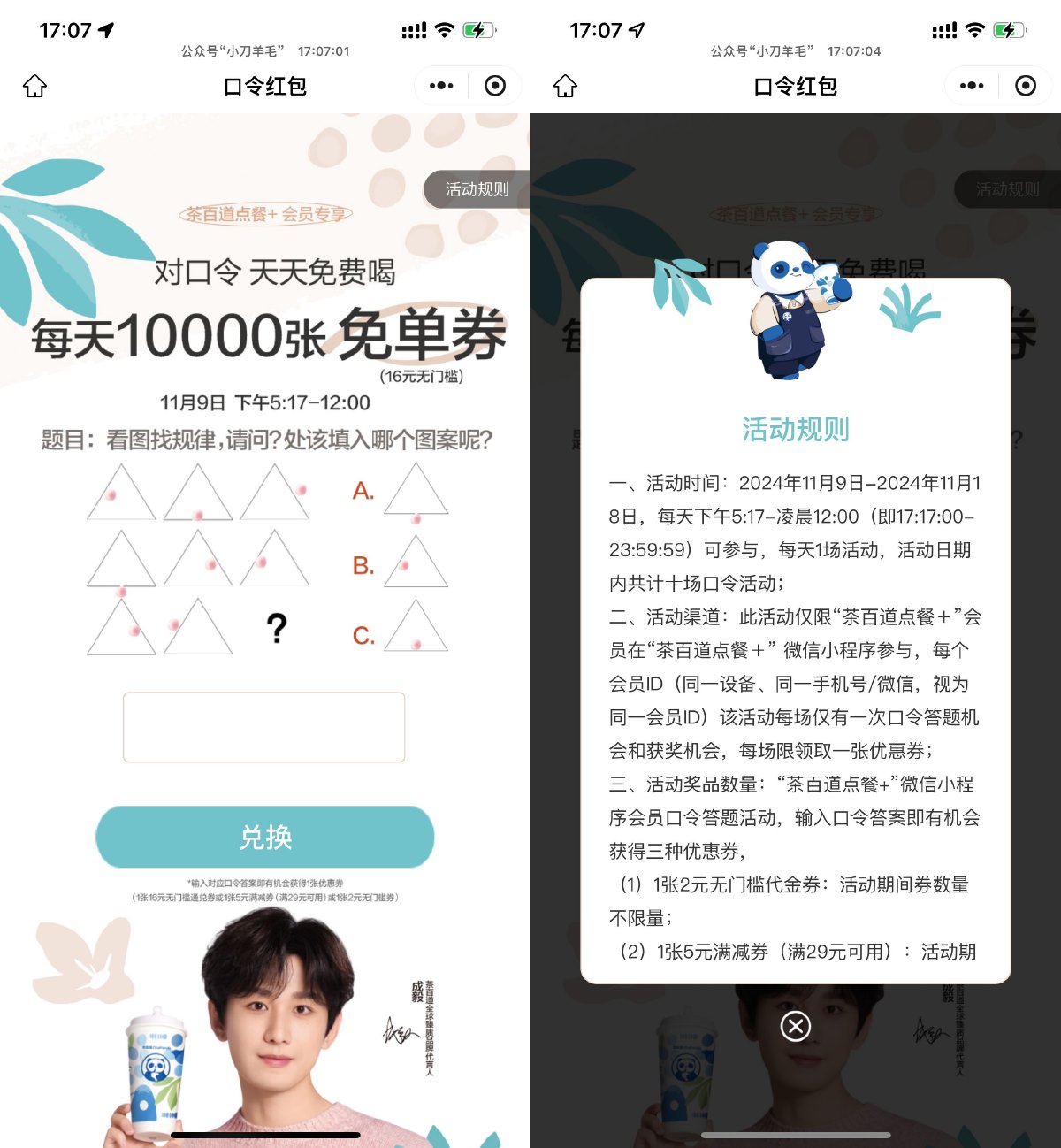 微信打开活动->11月9日~18日每天17点17分,输口令抢1万张免单券