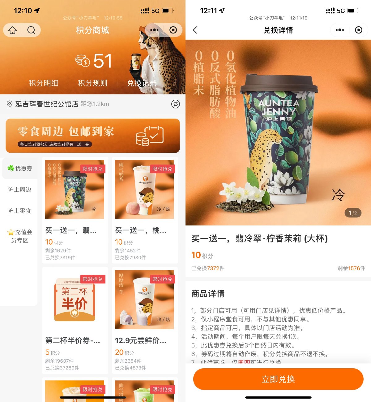 微信打开活动->10积分兑换买一送一券,共有4个饮品可兑换